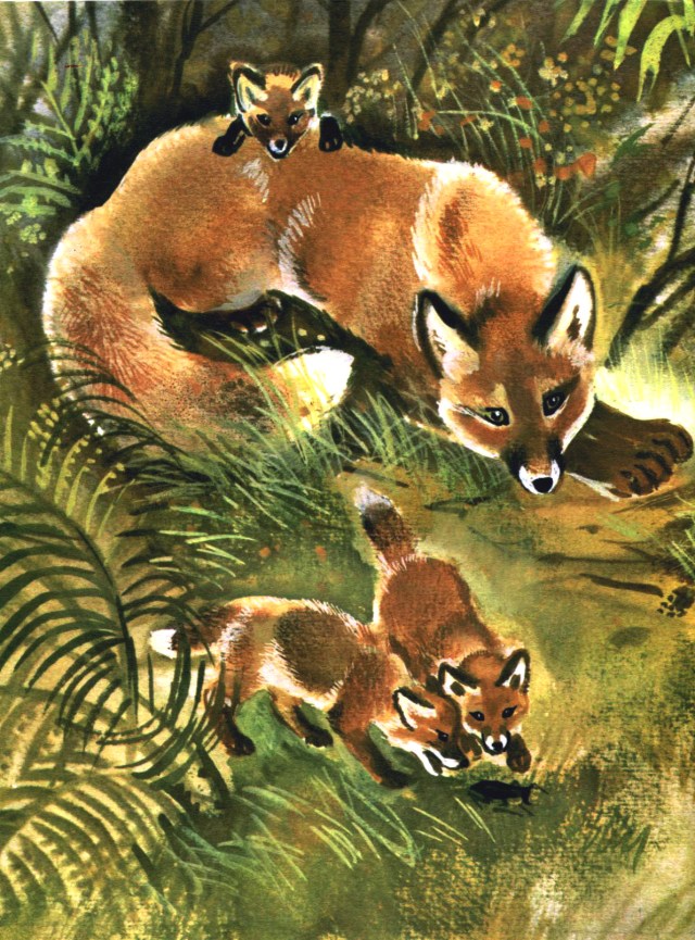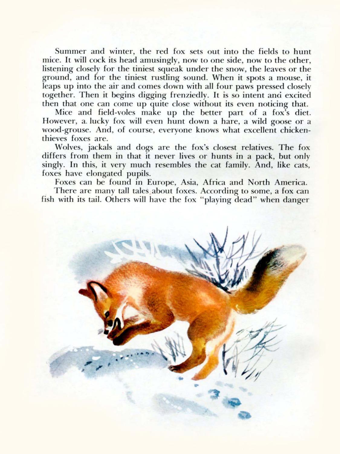 This short book (12 pages) is a book about foxes and their habits and habitats. We start the book with a family of a vixen who is raising a litter of little foxes. The author then describes the three types of foxes that are found in Russia, and their habitats. Finally, we come back to the start of the book..